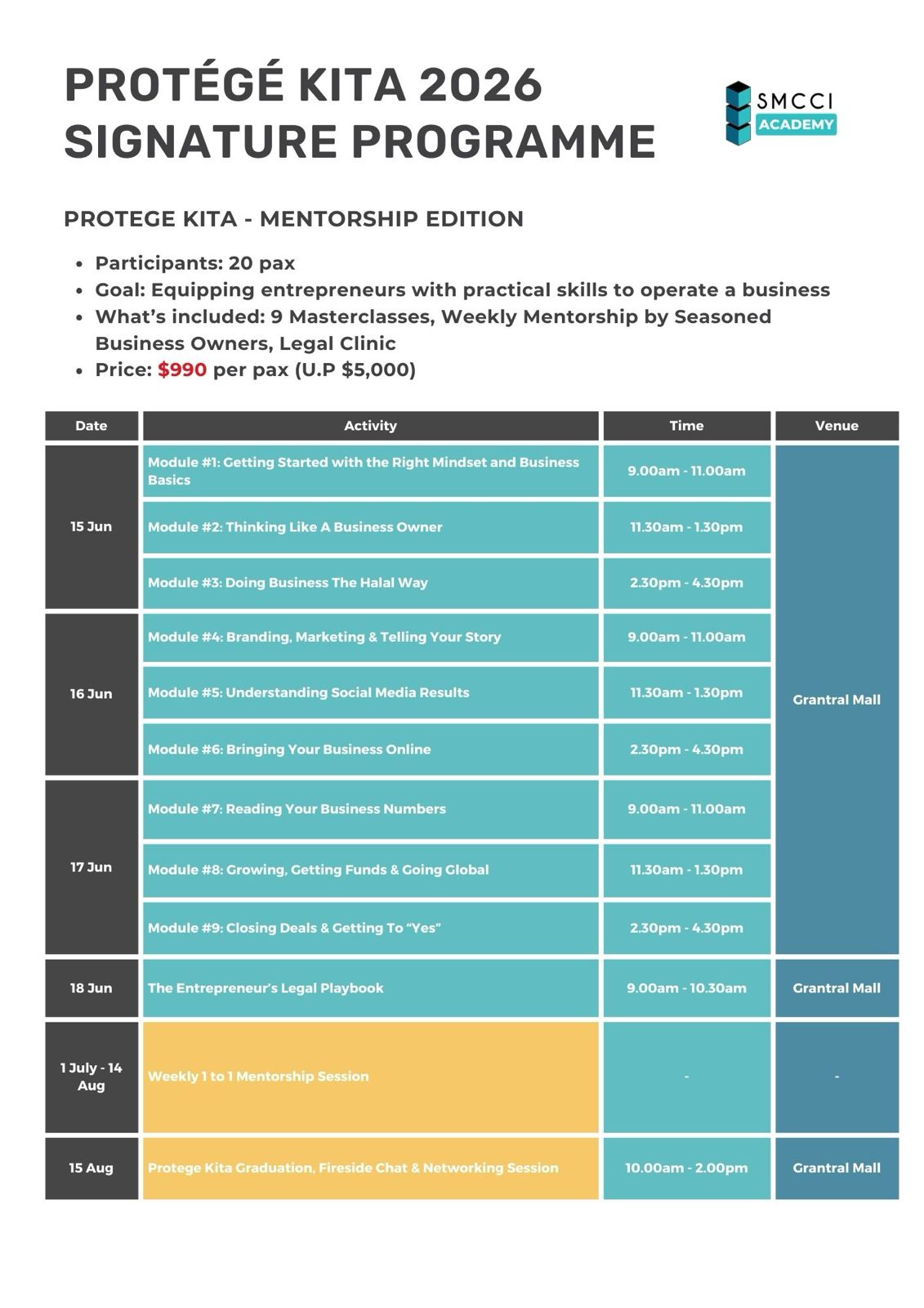 Protégé Kita is a specially curated signature programme by SMCCI Academy, designed for aspiring and early-stage entrepreneurs who are serious about growing their business with clarity, structure, and expert support.